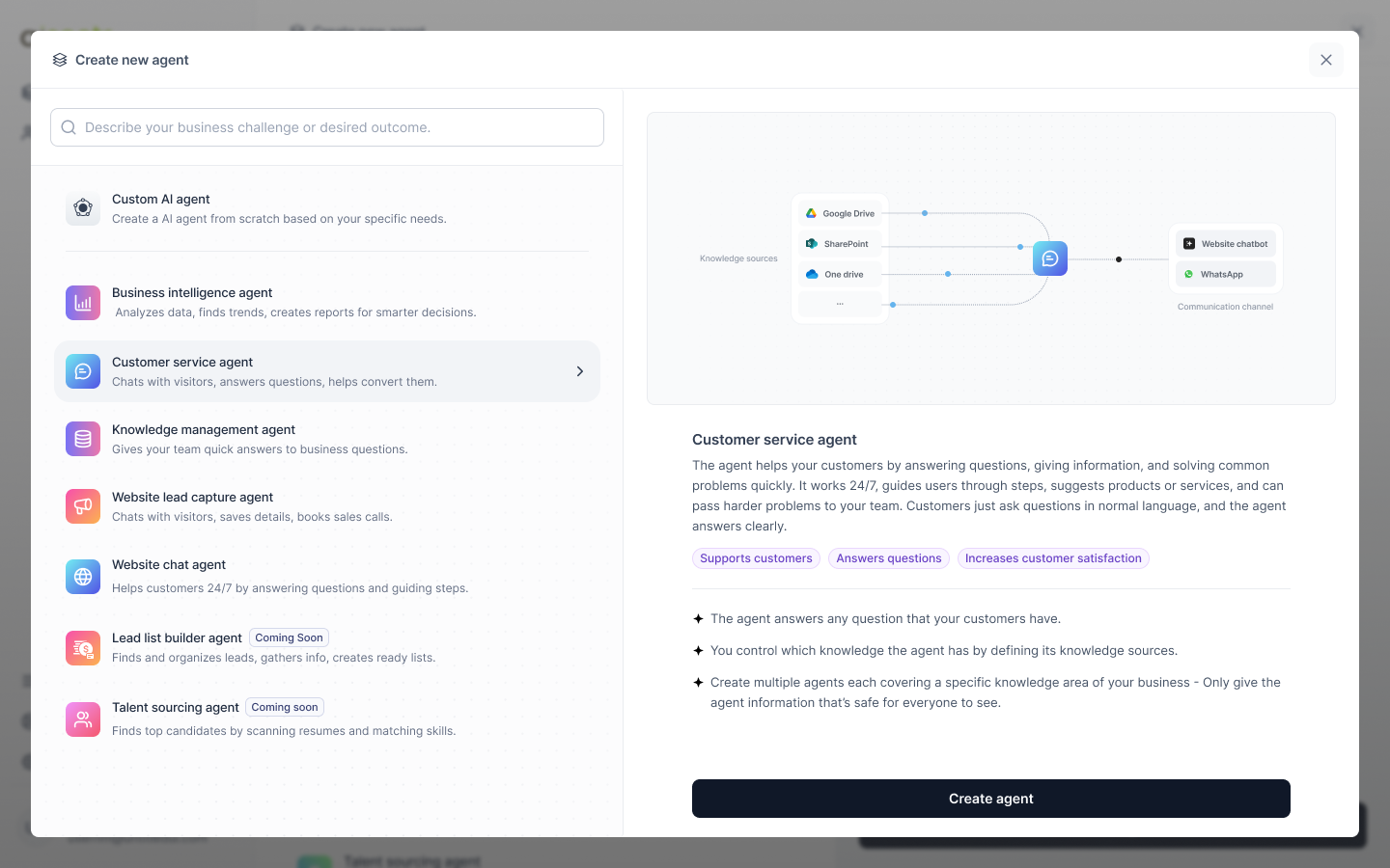 We’ll guide you through creating, configuring and deploying your agent – no technical expertise needed. Just click, create and get started.