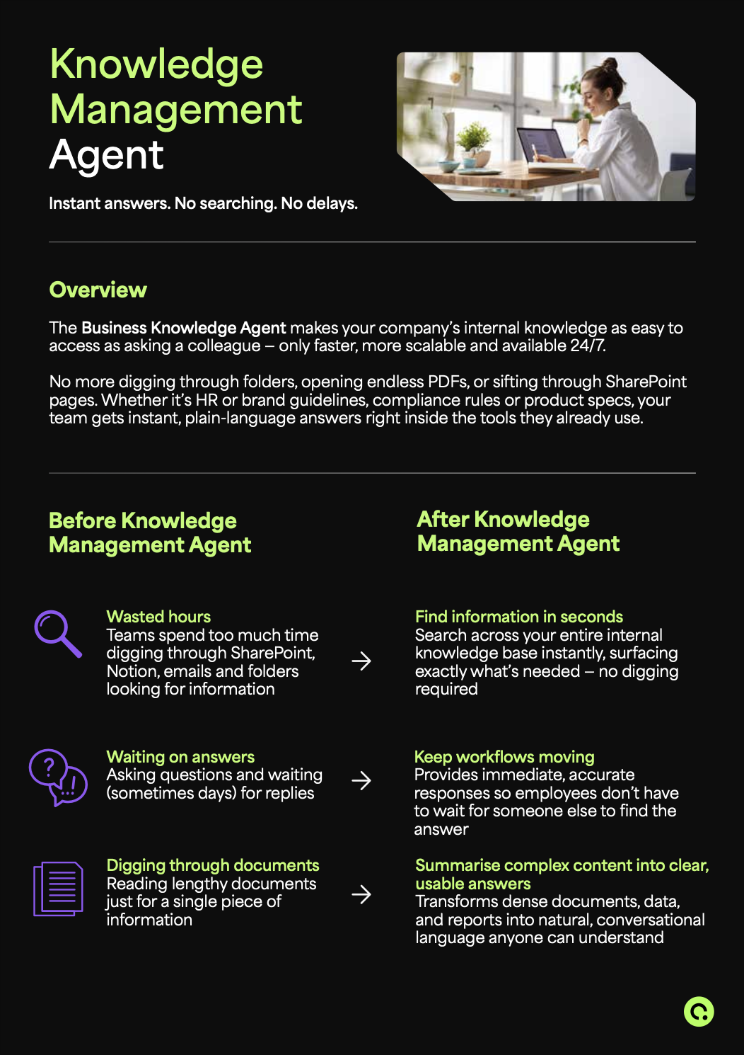 Learn how our Knowledge Management agent makes your company’s internal knowledge immediately accessible across all teams.