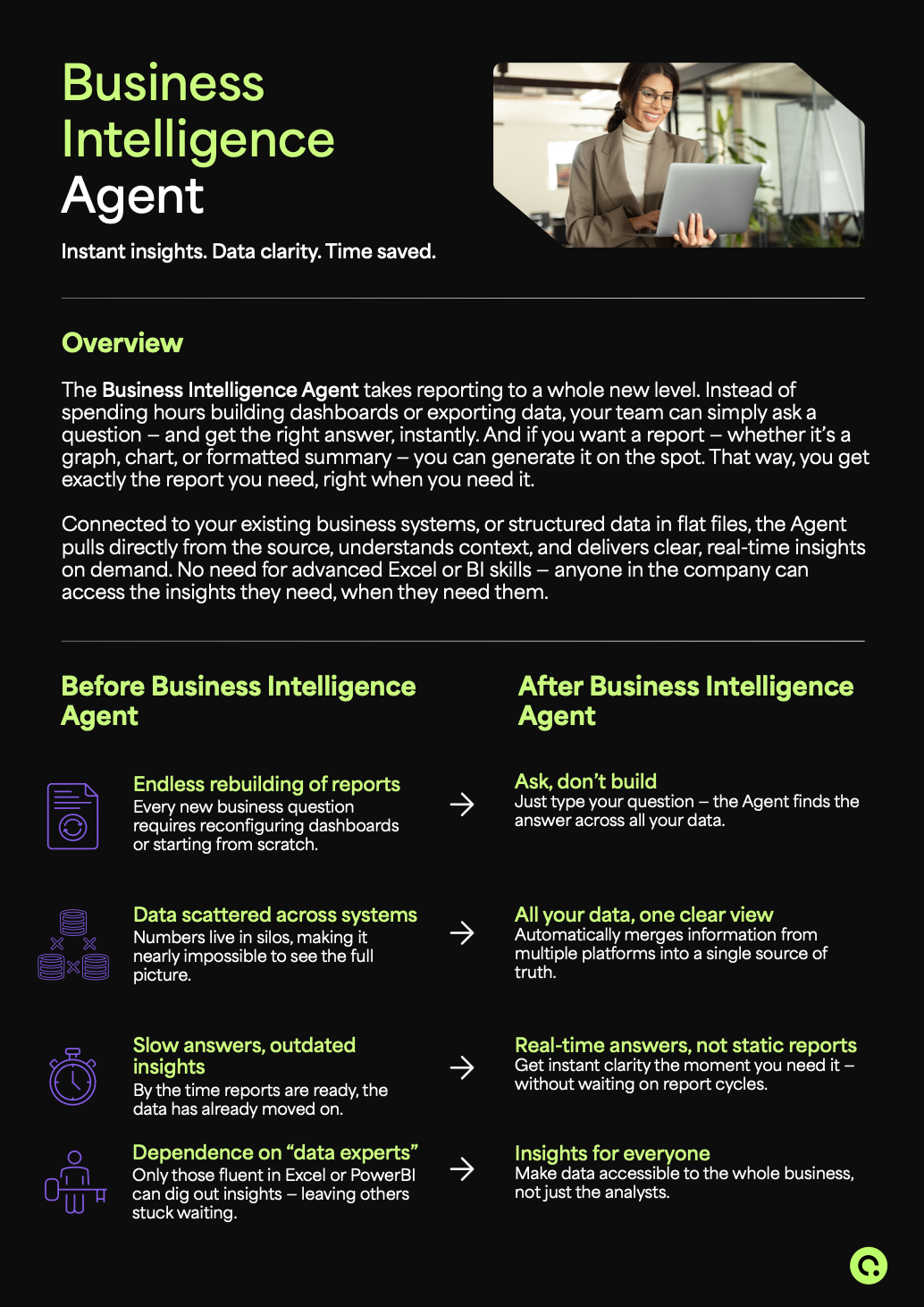 Change the way your teams approach reporting with our Business Intelligence Agent.
